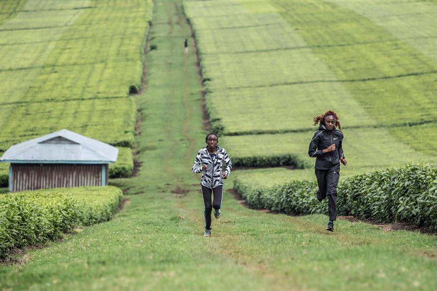 En el pequeño pueblo de Duka Moja, en el suroeste de Kenia, la pista de entrenamiento ahora discurre entre plantaciones de té: una serpiente marrón y arenosa en medio del verde esmeralda del té, plantado en medidos cuadrados, donde las jornaleras cortan las hojas y las lanzan a las cestas que cargan en la espalda a un ritmo casi coreografiado.
