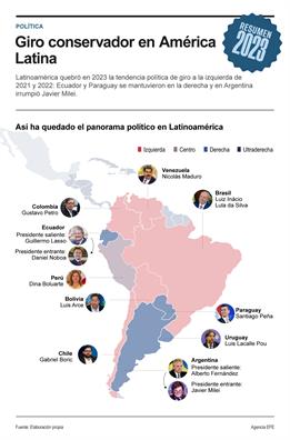 Buenos Aires/Caracas/México, 15 dic (EFE).- Latinoamérica rompió en 2023, con la reciente victoria de Javier Milei en las presidenciales de Argentina, la tendencia política de giro a la izquierda que desde dos años antes se venía produciendo en los gobiernos de la región, como Chile, Brasil, Colombia, Perú y Honduras.