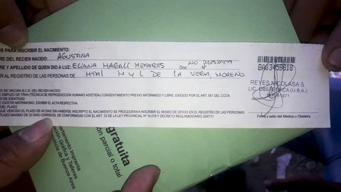 La constancia que le entregaron a la familia, por el nacimiento de Agustina, en el hospital.