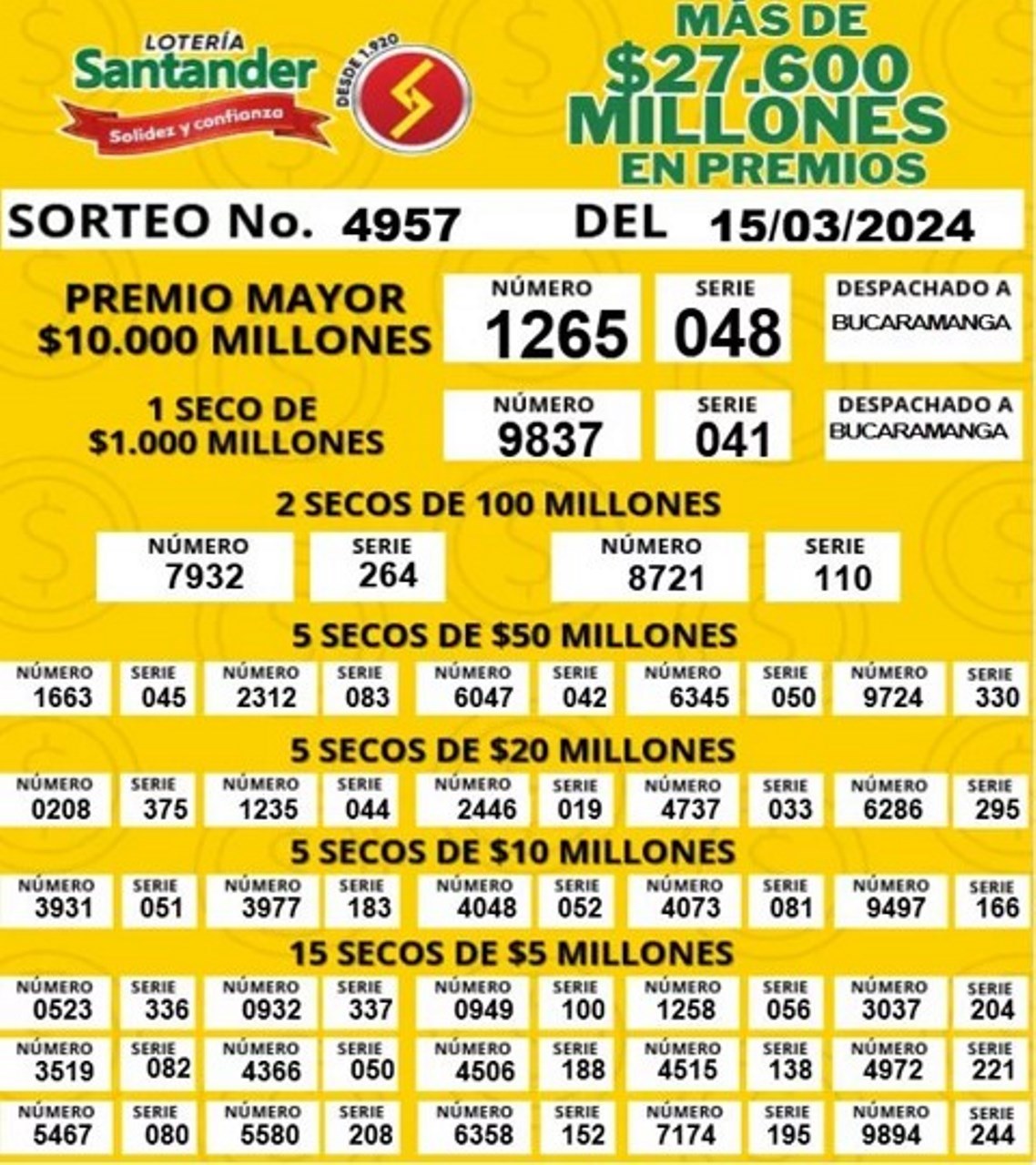 Resultados de la Lotería de Santander, marzo 15