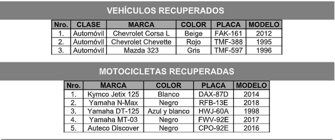 Por su parte, las motocicletas recuperadas corresponden a una Kymco Jetix 125 Blanco, placa DAX-87D, una Yamaha N-Max Negro, placa RFB-13E, la Yamaha DT-125 Azul y blanco, de placa HWJ-60A; una Yamaha MT-03 Negra, placa FWV-92E y una Auteco Discover Negro, de placa CPO-92E.