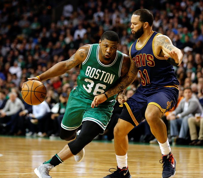 Marcus Smart (i) de Celtics de Boston avanza ante Deron Williams (d) de los Cavaliers de Cleveland hoy, miércoles 5 de abril de 2017, durante un partido de baloncesto de la NBA en el TD Garden en Boston, Massachusetts, EE.UU. EFE