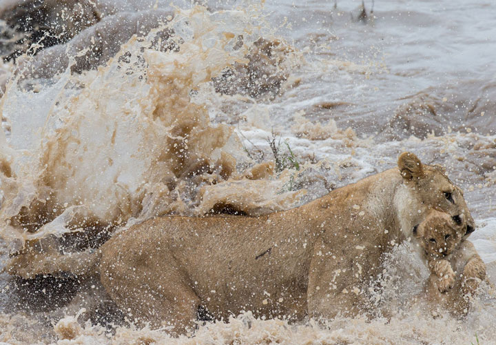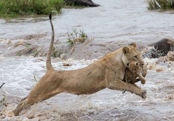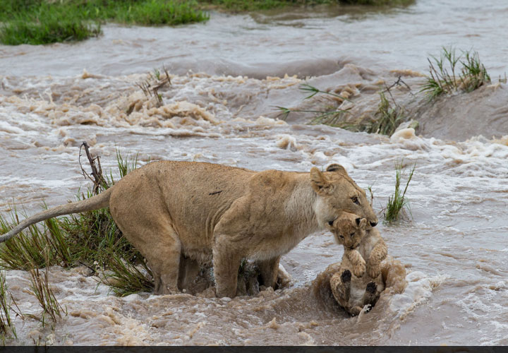 La leona y su cría intentaban seguir al resto de la manada, pero se retrasaron. El río había crecido mucho, por lo cual la mamá leona tuvo que hacer gala de su fuerza para cruzar llevando a su cría en la boca.