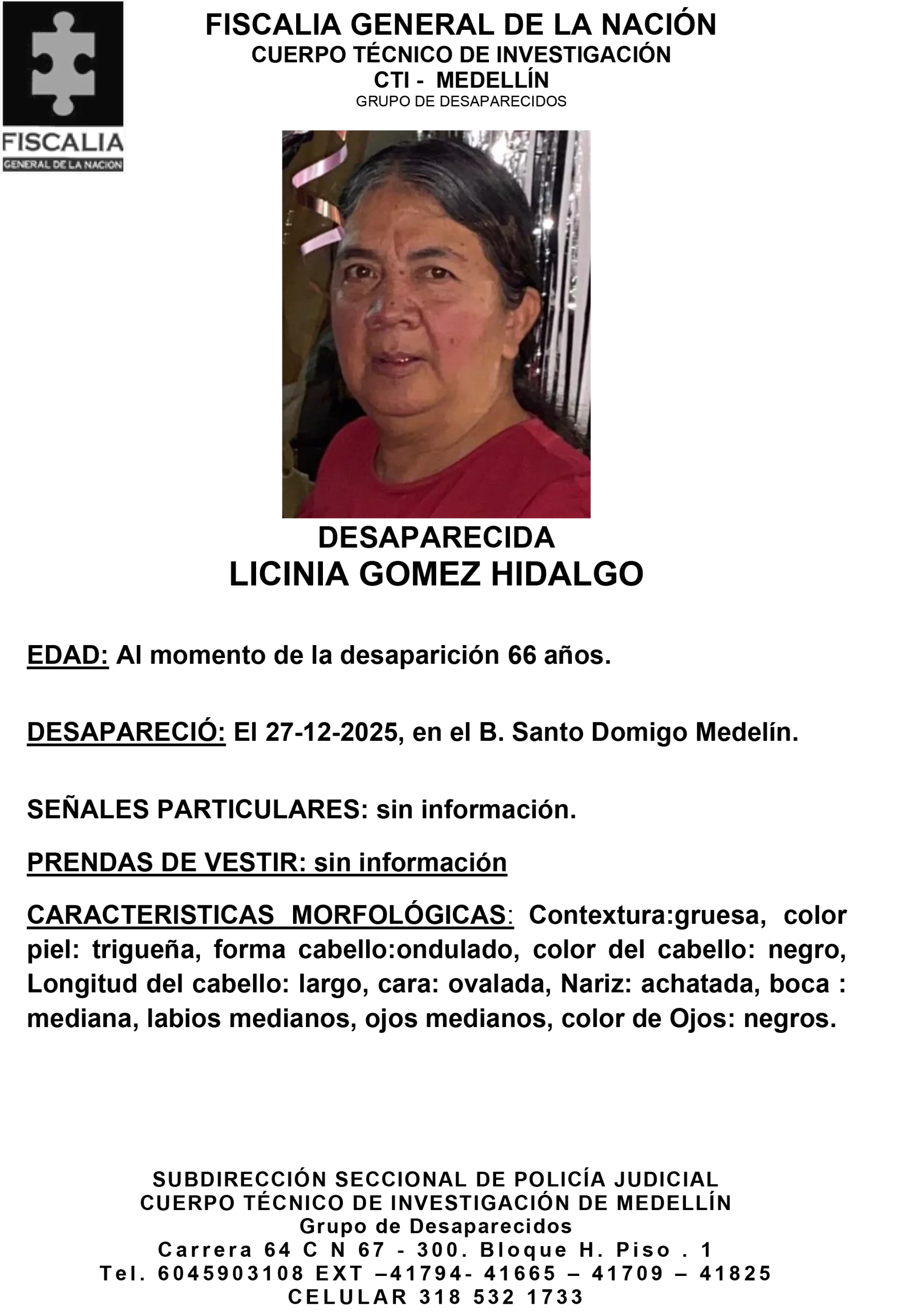 Licinia Gómez Hidalgo tenía 66 años al momento de su desaparición. Fue vista por última vez el 27 de diciembre de 2025 en el barrio Santo Domingo, en Medellín.