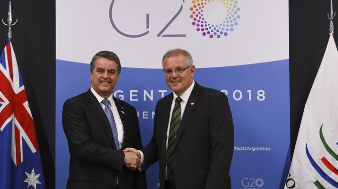 El primer ministro australiano, Scott Morrison, saluda al director general de la Organización Mundial de Comercio