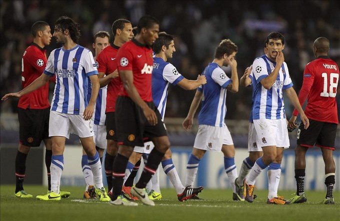Incidencias: 30.000 aficionados llenaron el estadio de Anoeta. Cerca de 2.000 seguidores del Manchester en las gradas. San Sebastián, 5 nov (EFE)