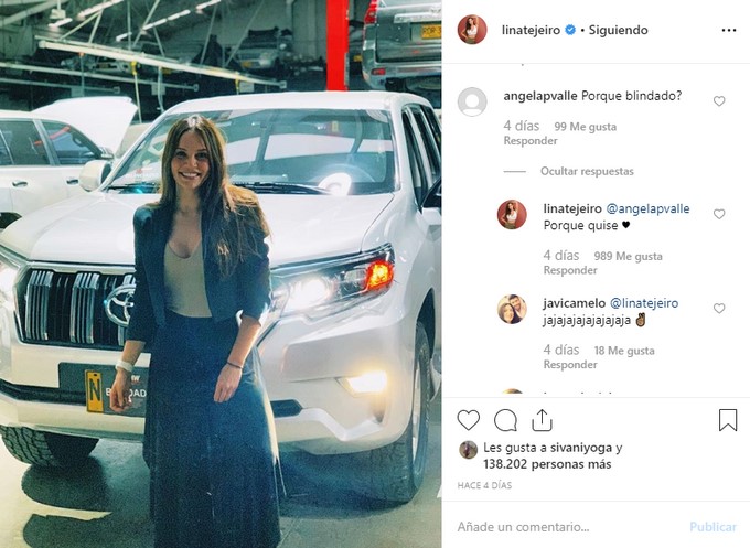 Lina estaba feliz y así lo mostró en su perfil oficial de Instagram, en el que publicó una imagen con la foto de su nueva camioneta, que tiene los vidrios blindados. De inmediato sus fans le dijeron que el vehículo estaba hermoso y que ella se veía aún más bella.