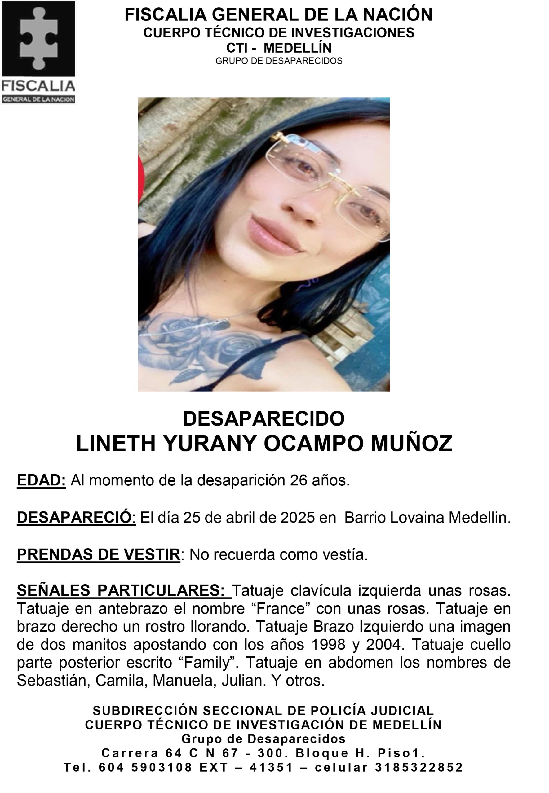 Resumen: Lineth Yurany Ocampo Muñoz, de 26 años, fue reportada como desaparecida el 25 de abril de 2025 en el barrio Lovaina, en Medellín.