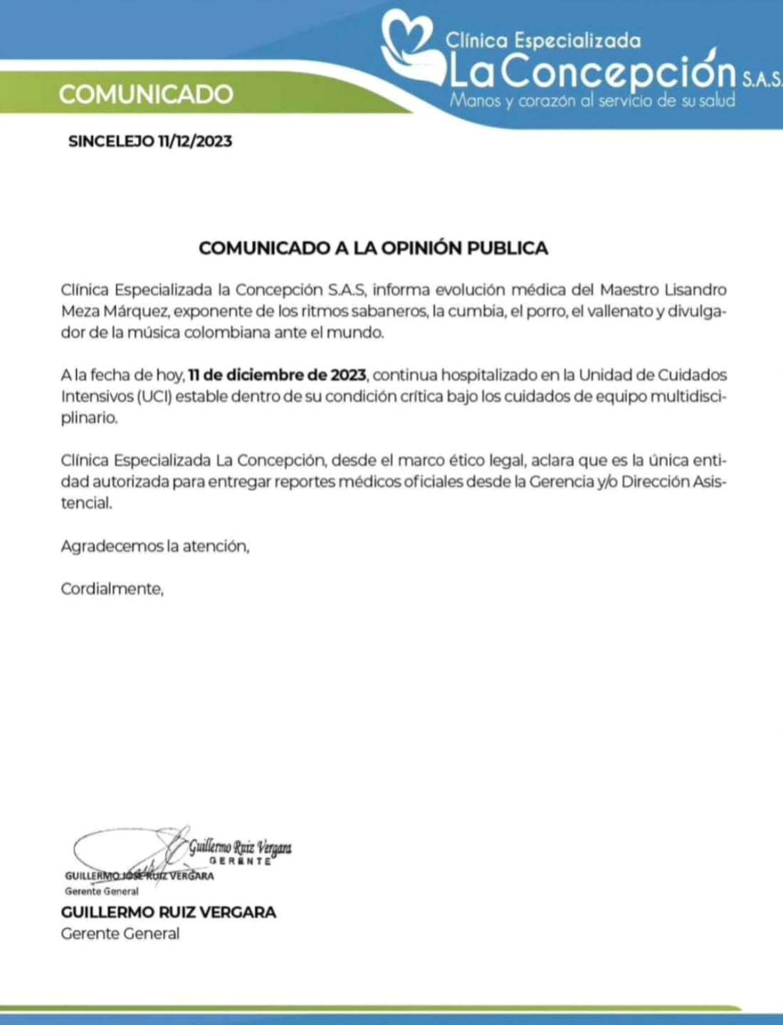 La Clínica Especializada la Concepción emite el comunicado del estado de salud de Linsandro Mesa.