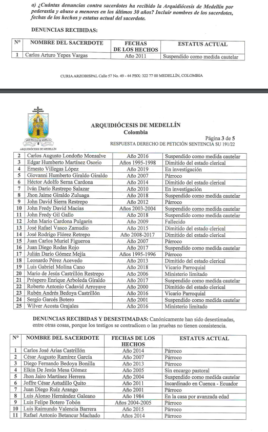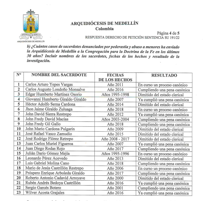 La Arquidiócesis de Medellín reveló un listado con nombres completos de los sacerdotes que en la ciudad han sido denunciados por pederastia y abuso sexual a menores de edad.