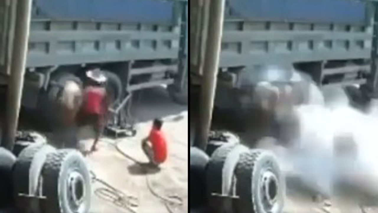 En video quedó el momento exacto en el que la llanta de un camión explotó en un taller mecánico de Vietnam mientras realizaban el cambio.