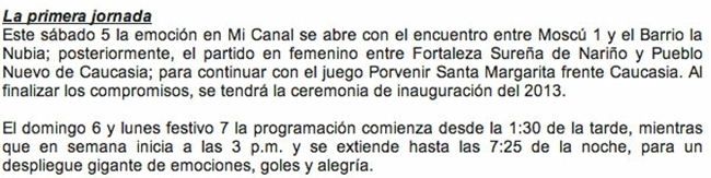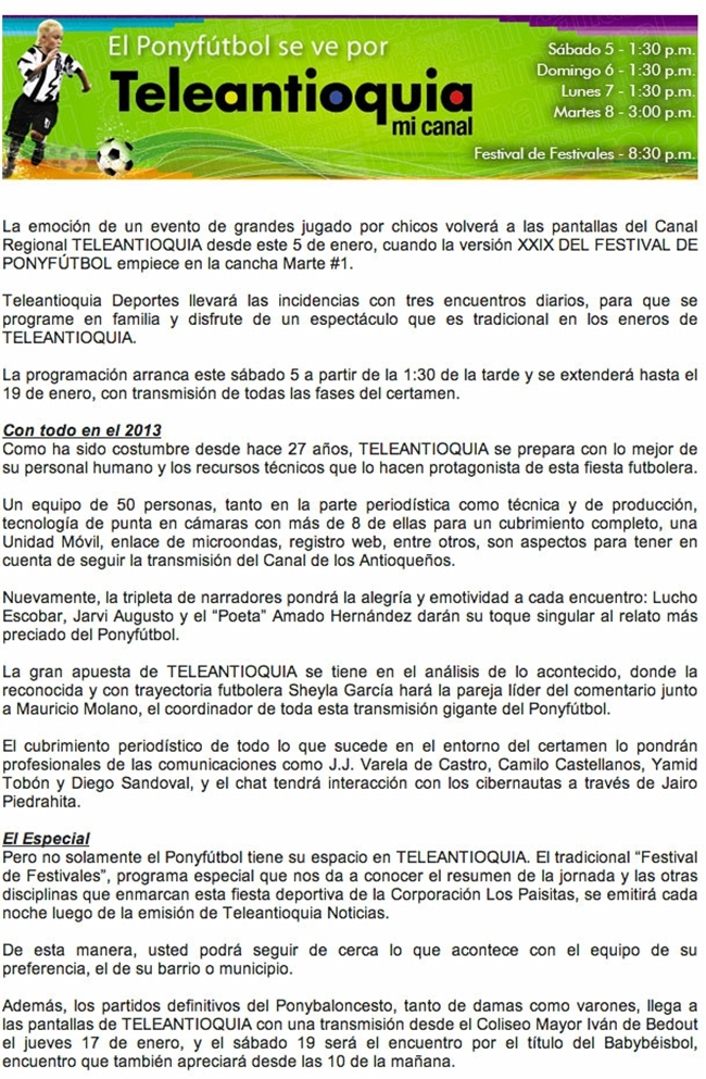 Minuto30.com .- Entre el 5 y el 19 de enero podrás vibrar con la emoción del XXIX Festival de Ponyfútbol por el canal regional Teleantioquia. El 5 de enero la inauguración será transmitida a partir de las 6:00 pm.