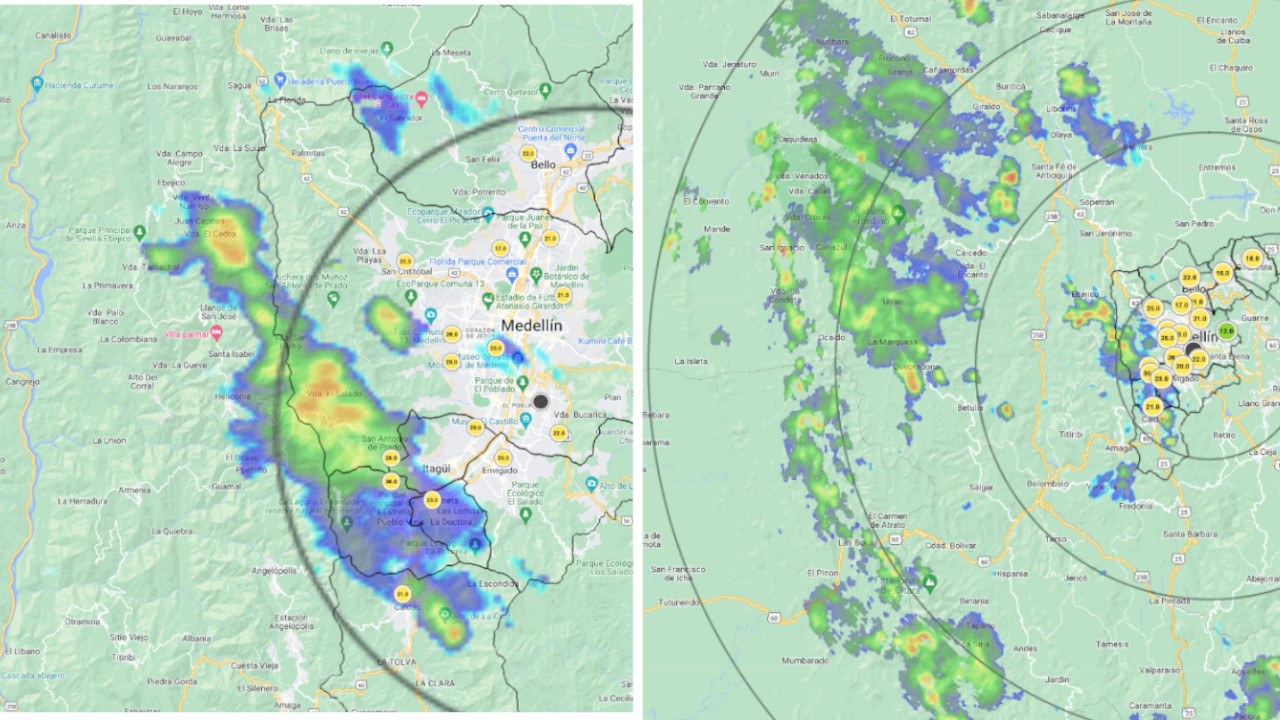 Minutos más tarde agregó que seguían las lluvias de moderada a alta intensidad sobre San Antonio de Prado y La Estrella, y de baja intensidad en Caldas, Sabaneta, Bello y el centro de Medellín. Se espera que las lluvias persistan por, al menos, 1 hora más.
