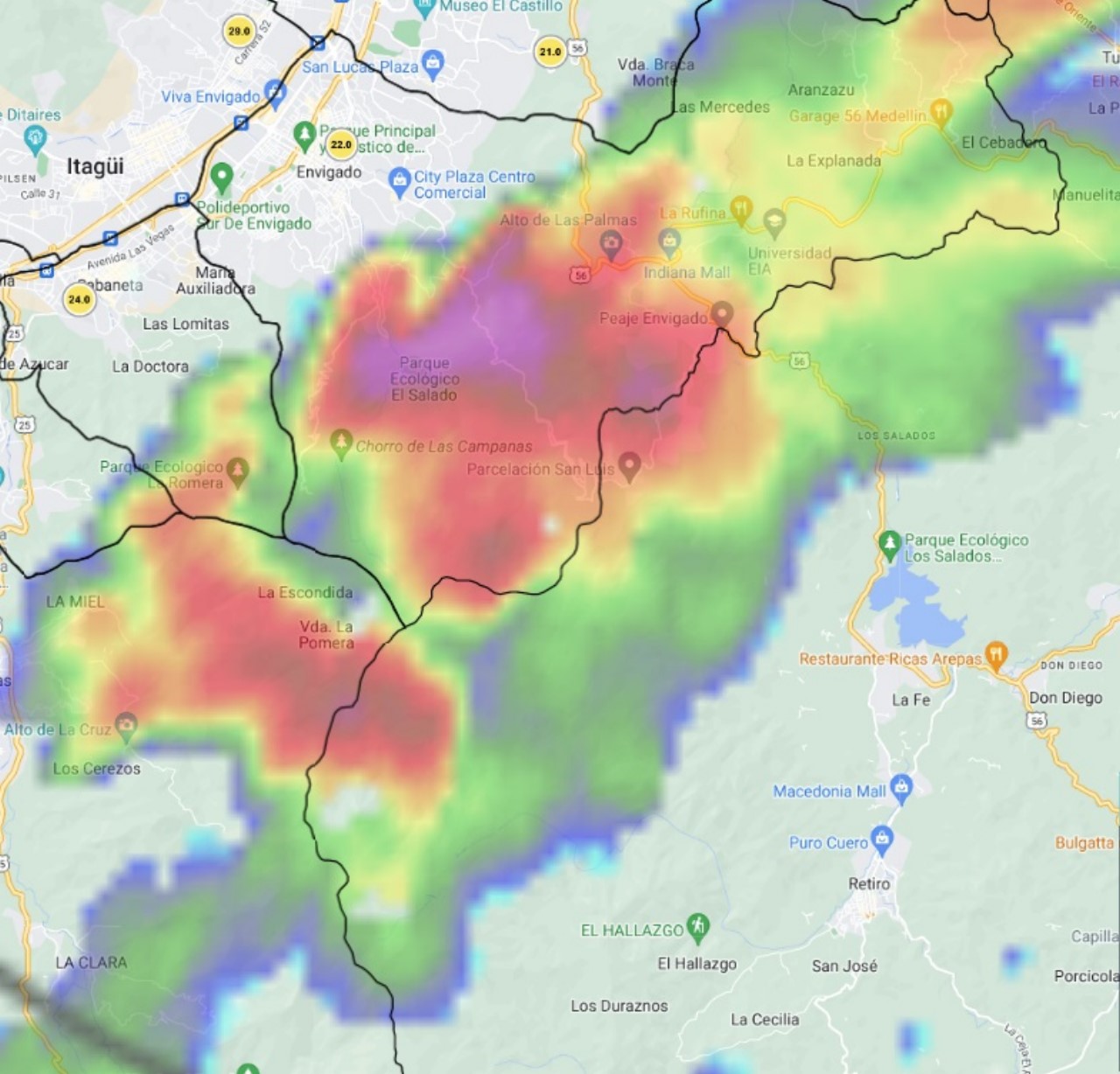 El Siata informó: “en el momento se registran lluvias de alta intensidad sobre la parte occidental de Envigado y Caldas. Las lluvias se están desplazando hacia el nororiente y se espera que continúen durante, al menos, la próxima media hora”.
