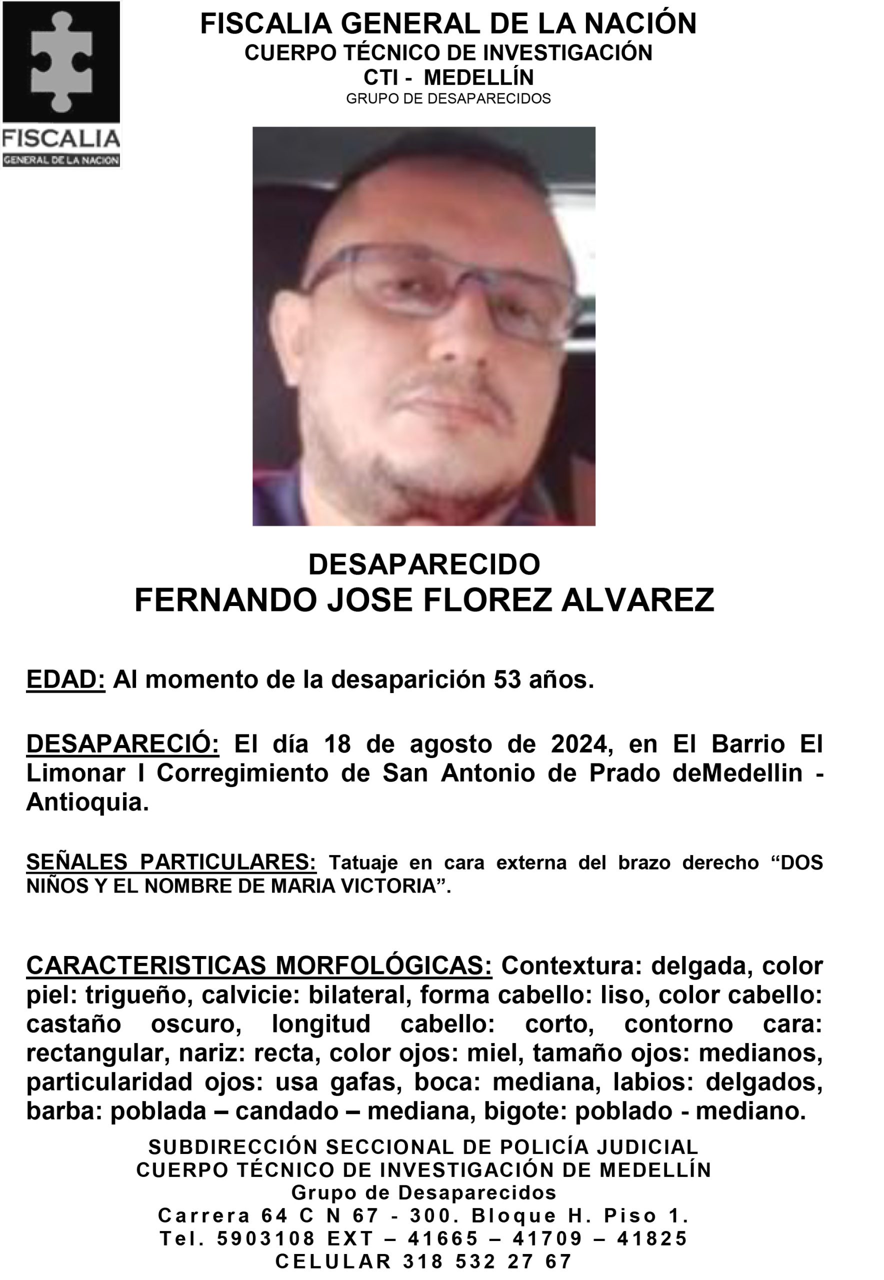Fernando José Flórez Álvarez, de 53 años, desapareció el 18 de agosto de 2024 en el Barrio El Limonar I, en el corregimiento de San Antonio de Prado, Medellín, Antioquia. Al momento de su desaparición, tenía un tatuaje en la cara externa del brazo derecho que representa “dos niños y el nombre de María Victoria”.