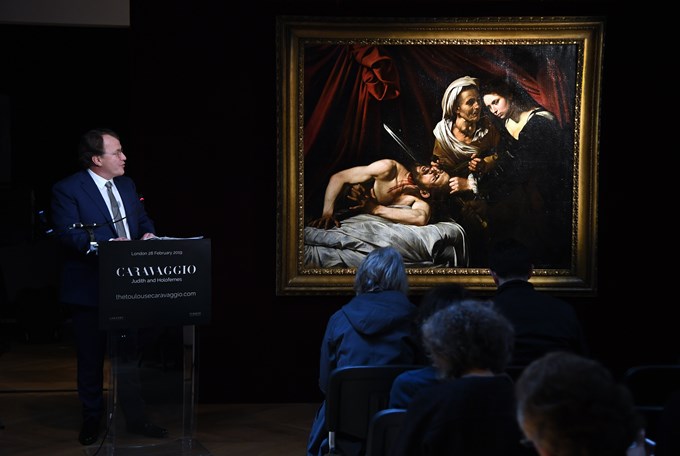 Presentación del cuadro “Judith decapitando a Holofernes” del artista italiano Caravaggio durante una rueda de prensa, este jueves, en Londres (Reino Unido). El llamado “Caravaggio perdido” fue descubierto por el subastador Marc Labarbe en un ático en Toulouse (Francia) hace cinco años. EFE
