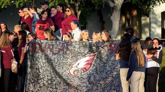 Numerosos carteles en los que se leen mensajes de ánimo y solidaridad, así como referencias a un mayor control de armas, llenan la entrada al centro educativo de la localidad de Parkland, en el condado de Broward, al norte de Miami.