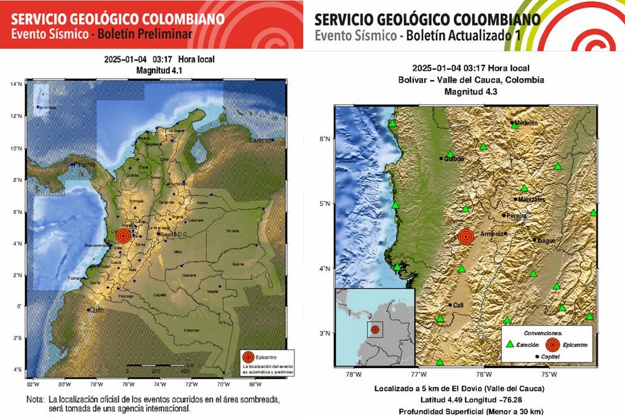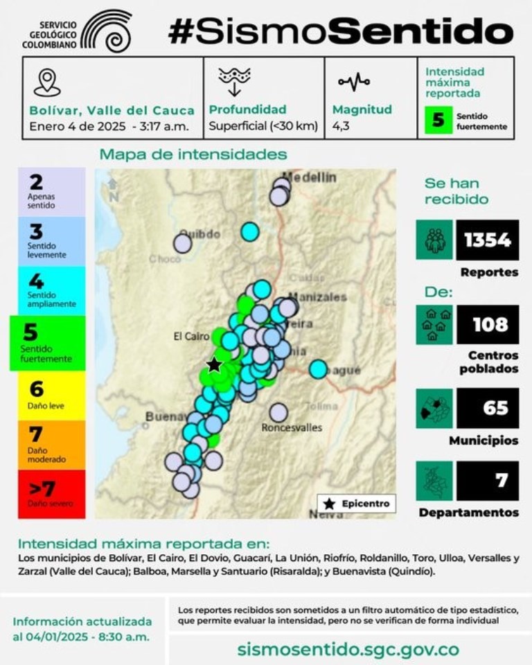 Minuto30.com .- A las 3:17 a.m. del 4 de enero de 2025, un sismo de magnitud 4.3 remeció la región andina, con epicentro en el municipio de Bolívar, al sur del departamento. La profundidad del sismo fue inferior a los 30 kilómetros, lo que generó una gran sensación de movimiento en varias zonas cercanas. El Servicio Geológico Colombiano recibió un total de 1354 reportes provenientes de 65 municipios ubicados en siete departamentos del país.