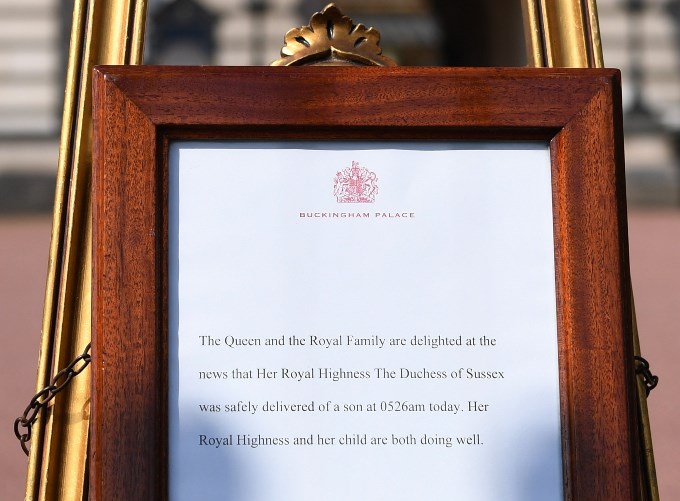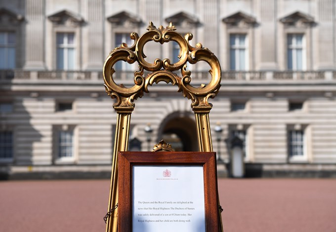 Una nota oficial anuncia el nacimiento del hijo de los duques de Sussex a las puertas del Palacio Buckingham. EFE/ Facundo Arrizabalaga