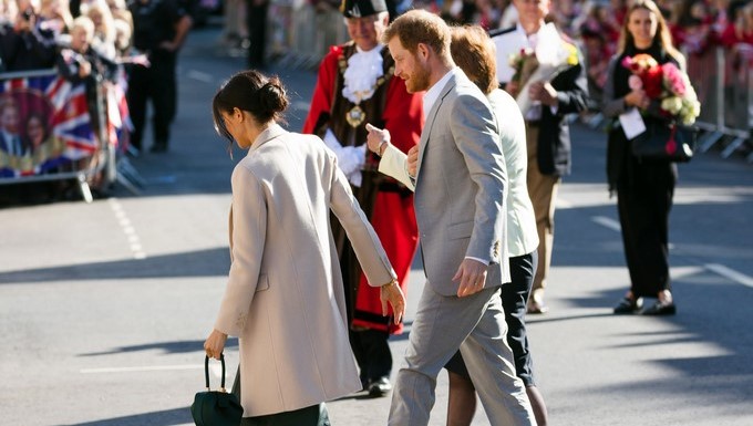 La pareja se bajó del coche oficial para saludar a las personas congregadas en las calles de la localidad, que da nombre el título nobiliario que la reina Isabel II otorgó al príncipe Enrique tras su boda el pasado 19 de mayo en el castillo de Windsor.