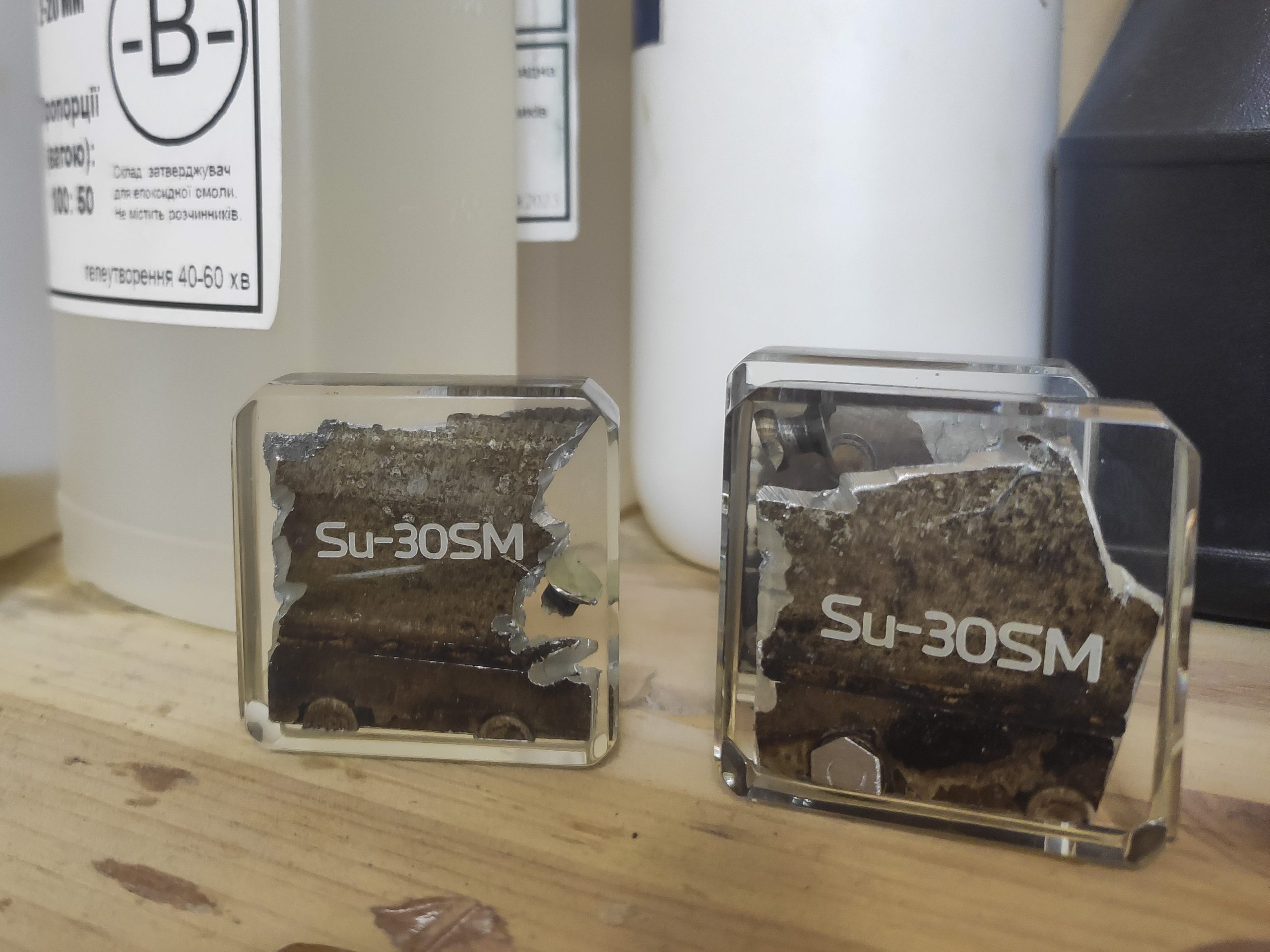 "Los recibo, los corto en fragmentos más pequeños y elaboro con ellos diferentes llaveros y figuras, revistiéndolos de resina de epoxi. Luego se venden online y los ingresos se usan en beneficio de los soldados ucranianos", explica mientras muestra una pieza mayor de un avión de combate derribado en 2022 en Mikoláiv (sur).