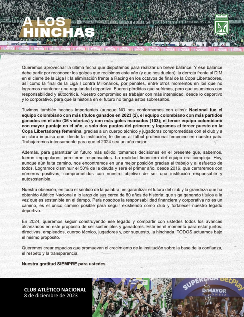 Atlético Nacional le envía carta a los hinchas con balance, propósitos para el 2024, donde reconocen lo malo y destacan lo bueno sin conformarse.