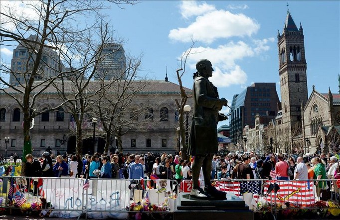 Varias personas se reúnen alrededor de un memorial a las víctimas del atentado en la maratón de Boston el pasado 24 de abril, en el parque Copley de Boston, Massachusetts (EE.UU.). EFE