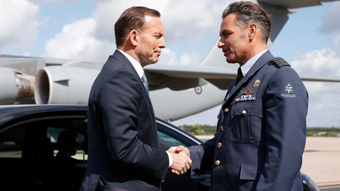 El comandante de las Fuerzas Aéreas holandesas, Johan van Soest (d), saluda al primer ministro australiano, Tony Abbott (i), durante una visita a la base aérea de Eindhoven. EFE