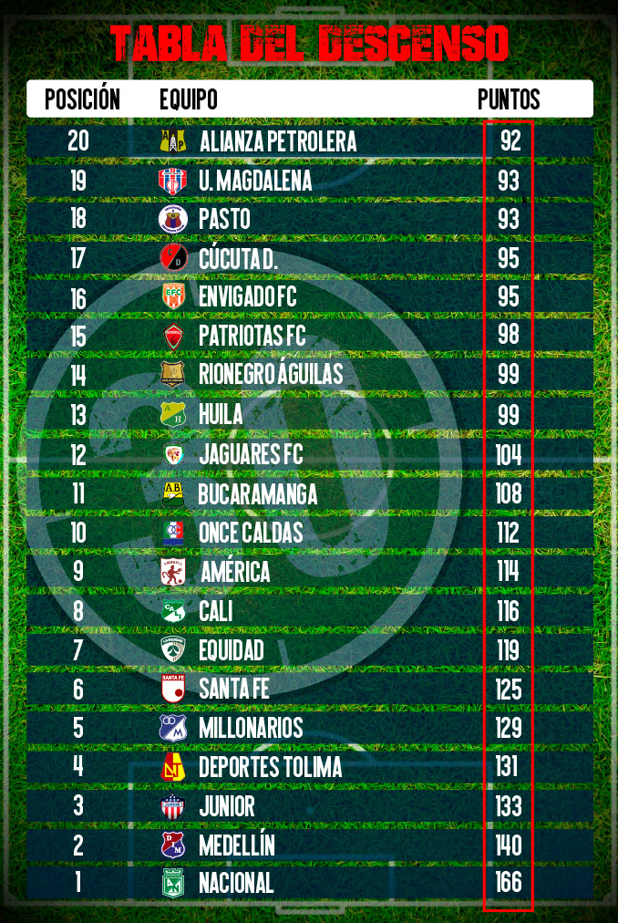 Si embargo, el descenso también inquieta a Deportivo Pasto, que tiene 93 unidades; y a Cúcuta Deportivo y Envigado, que lo anteceden, cada uno con 95.