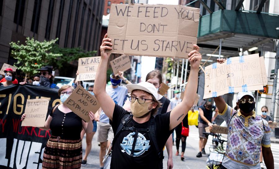 Trabajadores del sector de la restauración de Nueva York, arrasado desde que la pandemia de COVID-19 hizo de la gran urbe su epicentro, reclamaron este miércoles al Gobierno de EE.UU. que amplíe las ayudas al desempleo que expiraron el viernes pasado sin un reemplazo e invitaron a la movilización para defender sus derechos frente a la precariedad.