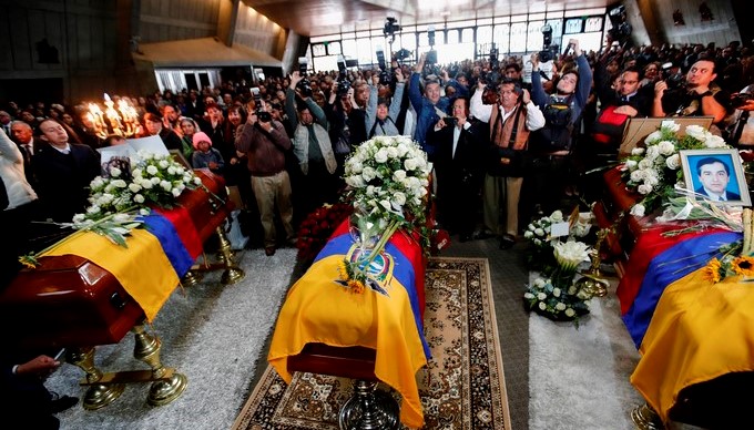 Cientos de personas acompañaron a los familiares del equipo periodístico en las exequias, en las que los ataúdes estaban cubiertos por la bandera de Ecuador y lucían arreglos florales junto a la fotografía de Ortega, Rivas y Segarra.