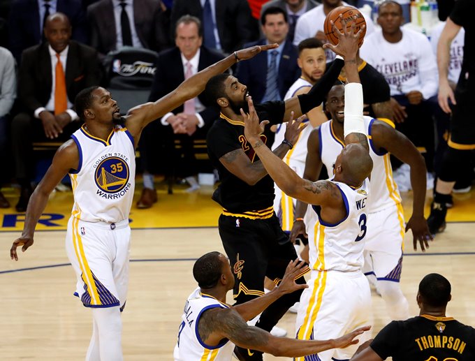 Los Guerreros de Golden State Kevin Durant (i) y David West (d) tratan de bloquear contra el jugador de Cleveland Cavaliers Kyrie Irving (c) en la primera mitad del partido cinco del juego de baloncesto de la NBA en el Oracle Arena de Oakland, California, Estados Unidos. EFE
