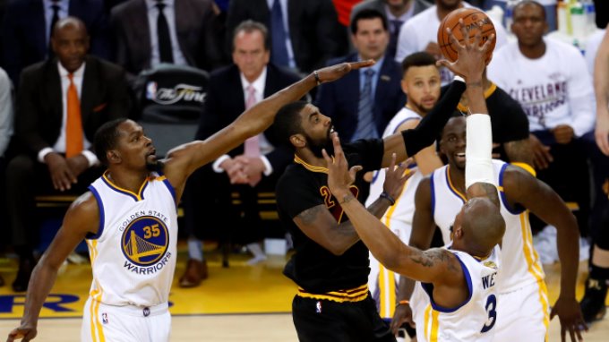 Los Guerreros de Golden State Kevin Durant (i) y David West (d) tratan de bloquear contra el jugador de Cleveland Cavaliers Kyrie Irving (c) en la primera mitad del partido cinco del juego de baloncesto de la NBA en el Oracle Arena de Oakland, California, Estados Unidos. EFE