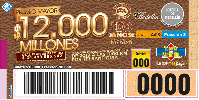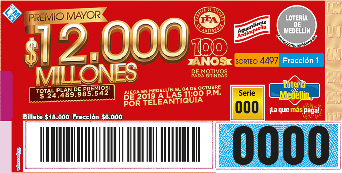 La Lotería de Medellín y la Fábrica de Licores de Antioquia (FLA), dos de las empresas más prestigiosas del Departamento y que mayores recursos le aportan a la salud de los antioqueños, se asocian en conmemoración a los 100 años de la FLA. Los billetes de la Lotería de Medellín de los sorteos del 4, 11 y 18 de octubre se revisten en color oro, en representación del color que acompaña el primer centenario de una fábrica que nos enorgullece.