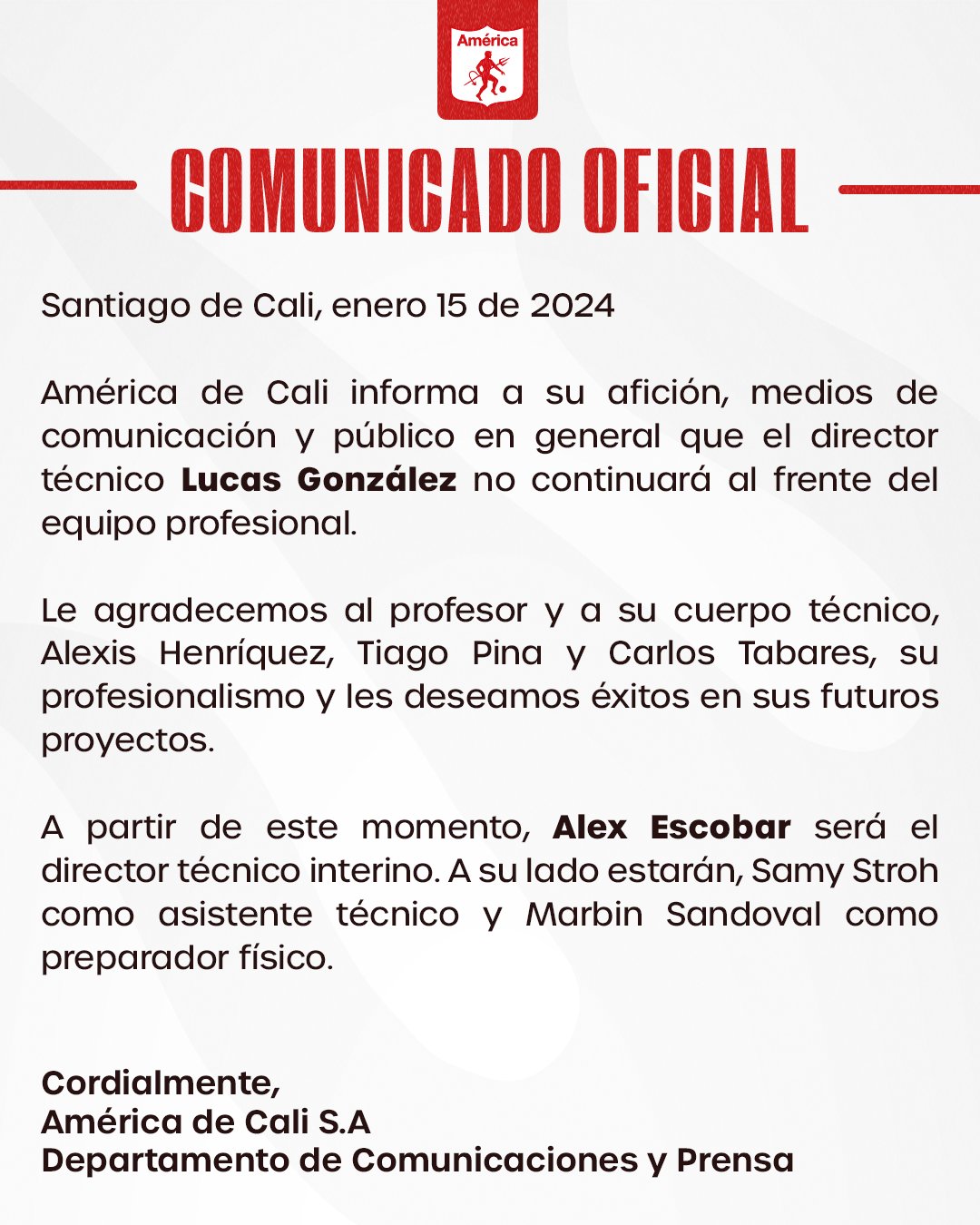 En el primer párrafo se anunció que Lucas no continuaría, en el segundo le agradeció a él y a su cuerpo técnico por el trabajo y en el tercer párrafo anunció a Alex Escobar como técnico interino.