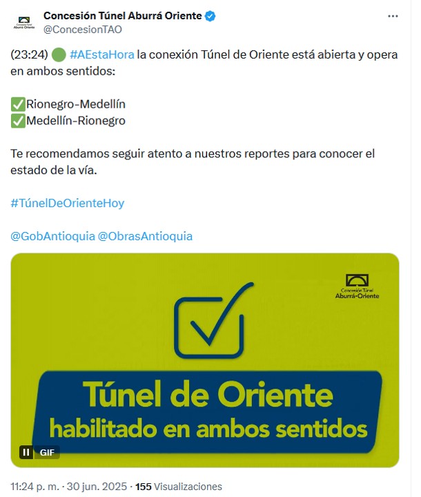 Minuto30.com .- La Conexión Túnel de Oriente fue completamente reabierta y opera con normalidad en ambos sentidos, tanto Rionegro-Medellín como Medellín-Rionegro. Así lo confirmó la Concesión Túnel Aburrá Oriente (@ConcesionTAO) a las 11:24 p.m. de este lunes 30 de junio.