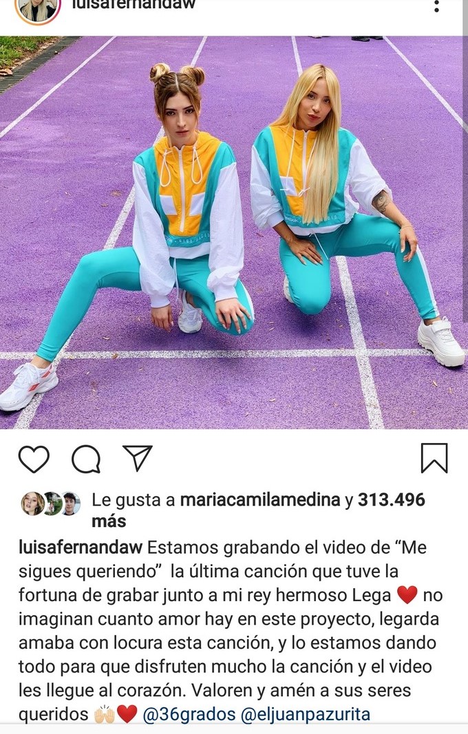 “Estamos grabando el video de ‘Me sigues queriendo’ la última canción que tuve la fortuna de grabar junto a mi rey hermoso Lega. No imaginan cuánto amor hay en este proyecto. Legarda amaba con locura esta canción y lo estamos dando todo para que disfruten mucho la canción y el video les llegue al corazón”, escribió la influenciadora junto a una fotografía.