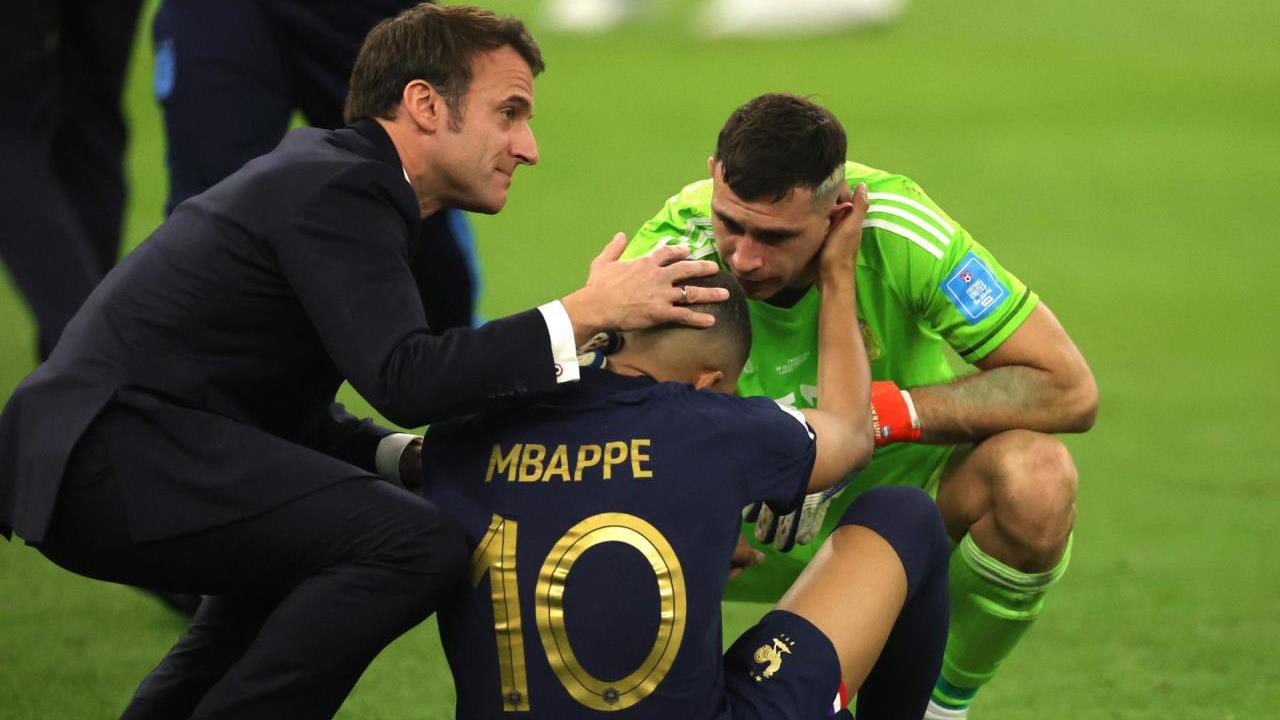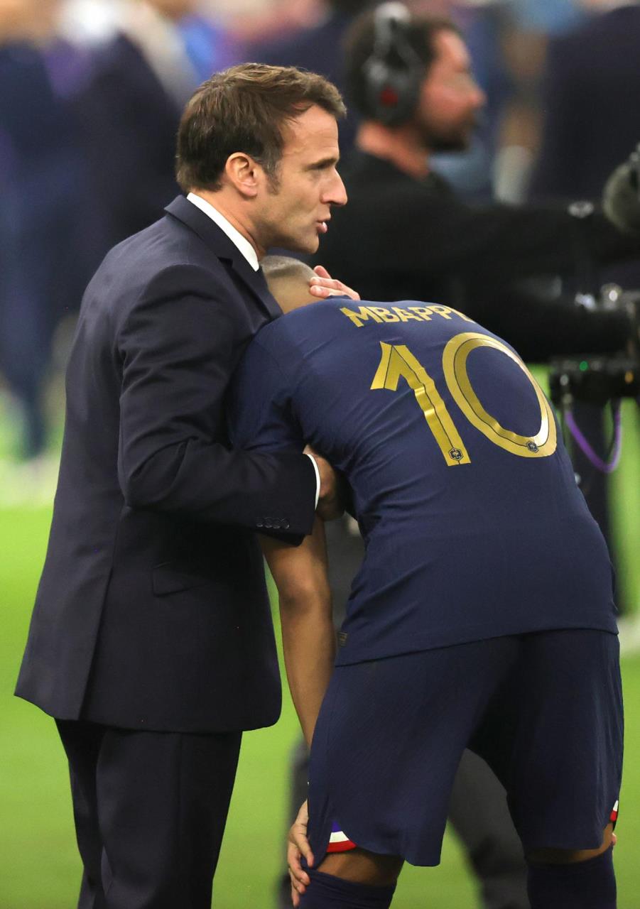 Tras intentar consolar a Mbappé, que se quedó un rato más sentado y abatido con la mirada en el infinito, Macron saludó al seleccionador Didier Deschamps y a otros jugadores franceses.