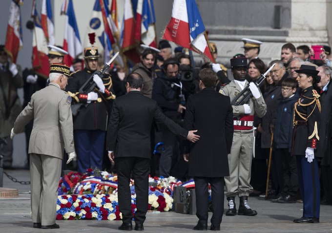 Bajo el Arco del Triunfo parisino, Hollande recibió con una sonrisa y un apretón de manos a Macron, su ministro de Economía entre 2014 y 2016, antes del traspaso de poderes, que tendrá lugar este fin de semana.