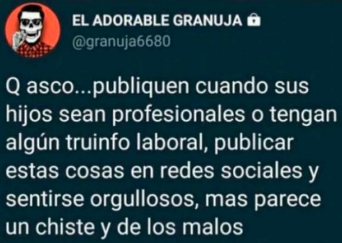 Qué asco… publiquen cosas cuando sus hijos sean profesionales o tengan algún triunfo laboral, publicar estas cosas en redes sociales y sentirse orgulloso más parece un chiste y de los malos”.