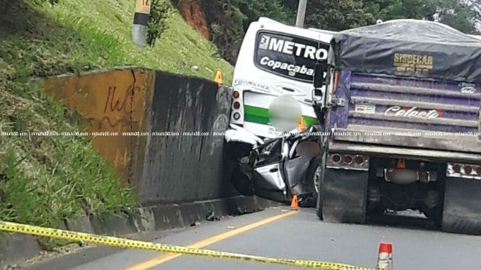 Minuto30.com- Las autoridades de Tránsito y judiciales detallaron que las víctimas mortales del múltiple accidente ocurrido el pasado lunes entre los municipios de Girardota y Copacabana eran la madre y dos hijos que viajaban a bordo de un vehículo particular.