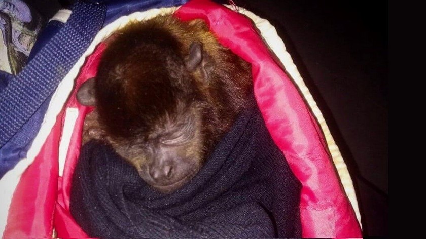 Según las autoridades, al ver la actitud del sujeto, se solicitó el registro y se logró identificar que en su equipaje escondía a un primate macho de la especie Alouatta seniculus conocido como mono aullador rojo.
