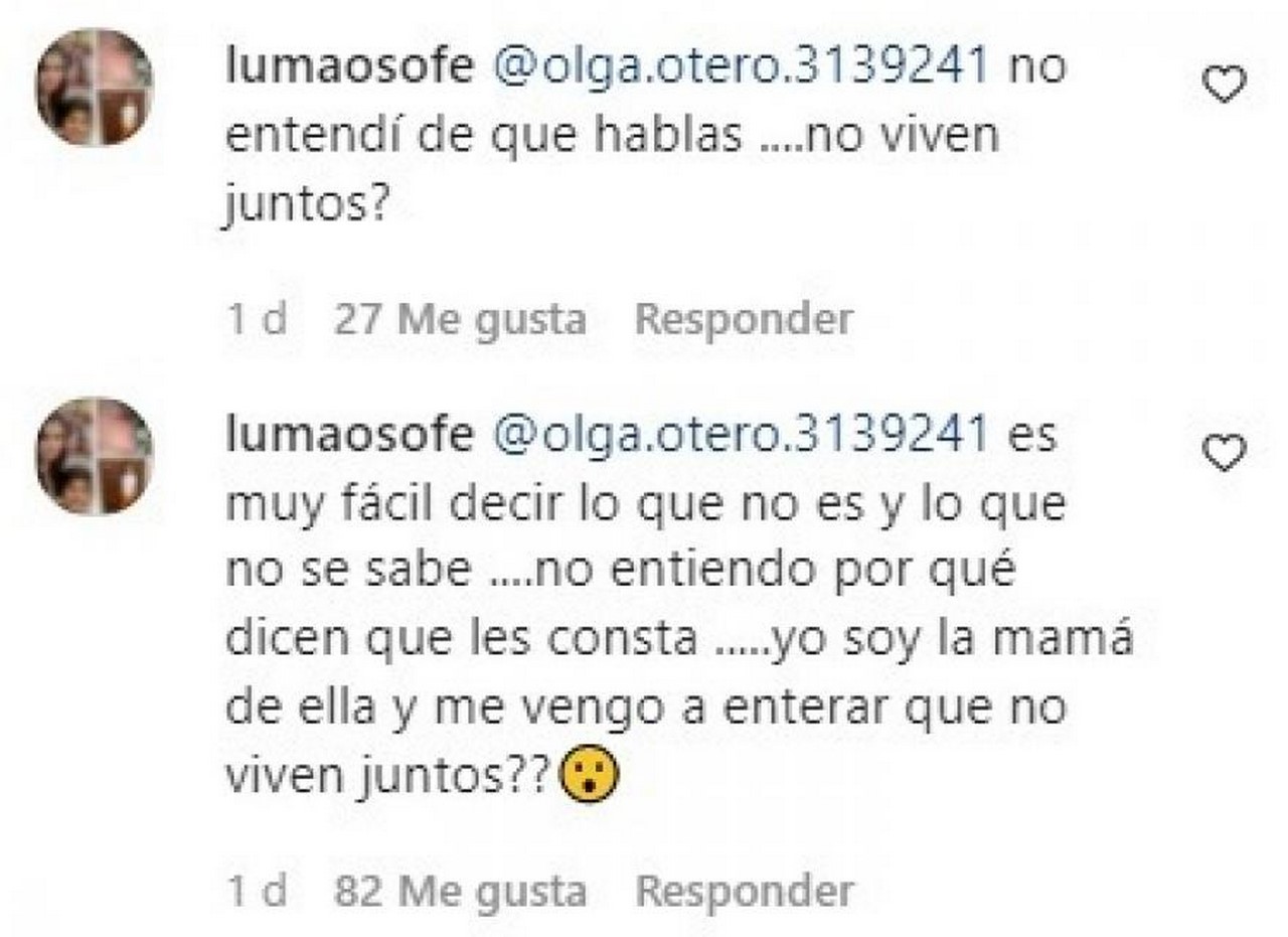 “Yo no entiendo porque Carolina Cruz dice que no vive con su marido y yo los veo juntos a toda hora, entonces por qué ella lo niega”, dijo una de la internautas en Instagram, por lo que Luz Marina contestó: “No entendí de qué hablas, ¿no viven juntos? Es muy fácil decir lo que no es y lo que no se sabe. No entiendo por qué dicen que les consta. Yo soy la mamá de ella y me vengo a enterar que no viven juntos”.