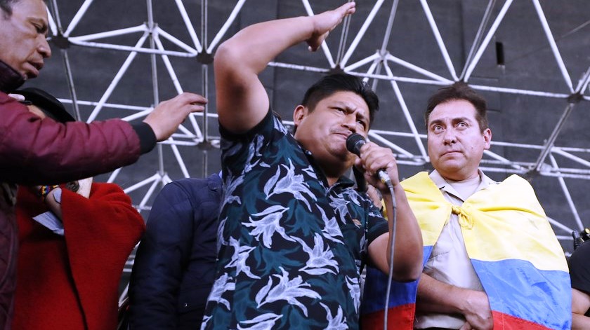 Jaime Vargas (c), presidente de la Confederación de Nacionalidades Indígenas de Ecuador (Conaie), habla junto a un policía retenido (d)