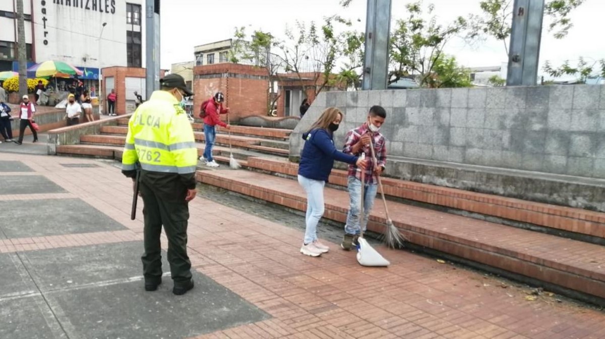 La Alcaldía de Manizales, a través de la secretaría de Gobierno, acompaña en la tarde de este miércoles, 9 de junio, el trabajo comunitario que realizan varios infractores en la plaza Alfonso López.