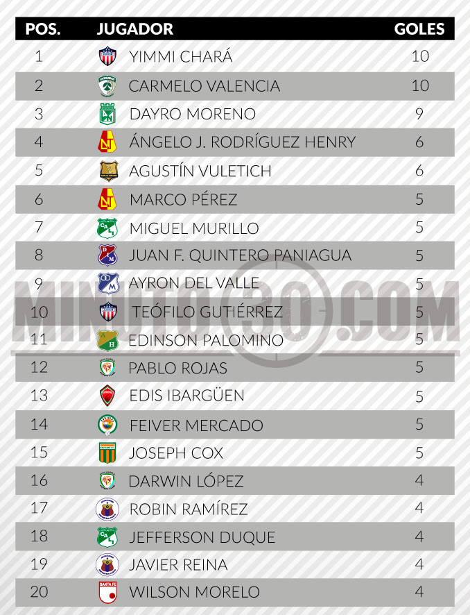 Minuto30.com- Carmelo Valencia, de La Equidad y Yimmi Chará, de Atlético Junior, protagonizan un interesante mano a mano en la puja por el liderato de la tabla de goleadores de la Liga Águila II-2017.