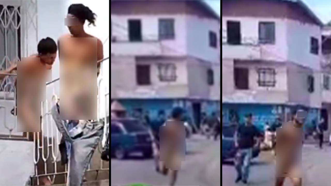 En algunos videos que han sido difundidos en redes sociales se puede ver como dos hombres están completamente desnudos y con la cara muy llena de vergüenza, llevan un letrero hecho en cartón y pegado con cinta que dice: “Por robar niños, RATAS”.