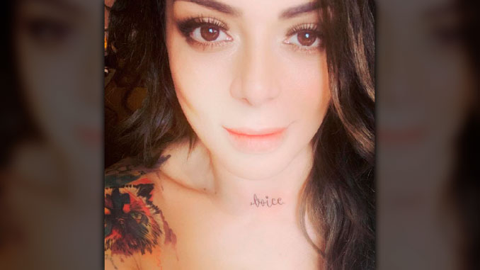 La intérprete de “Collar de perlas” se tatuó en la mitad de su cuello la palabra “voice” que en español significa “voz”, un homenaje al gran talento que tiene la cantante y que ella sabe explotar muy bien.