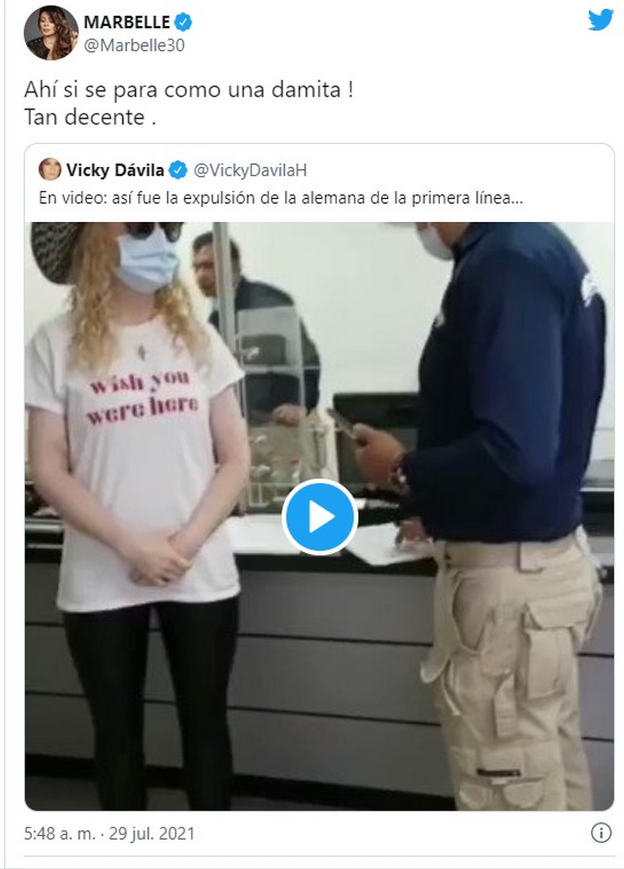 A través de su cuenta de Twitter, la artista hizo varios trinos en contra de la ciudadana alemana Rebecca Sprösser, quien fue expulsada del país luego de haberse integrado al grupo Primera Línea en Cali en medio de las manifestaciones del paro nacional.
