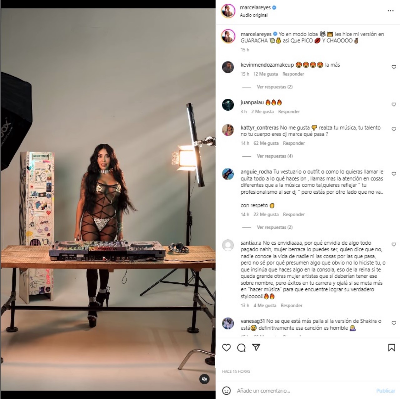 “No me gusta 👎 realza tu música, tu talento no tu cuerpo eres dj marce qué pasa? (sic*)”, “Tu vestuario o outfit o como lo quieras llamar le quita todo a lo qué haces bien”, “Entonces si no muestra no vende ”, “Ni Yina se atrevió a tanto”, son algunos de los comentarios del post.